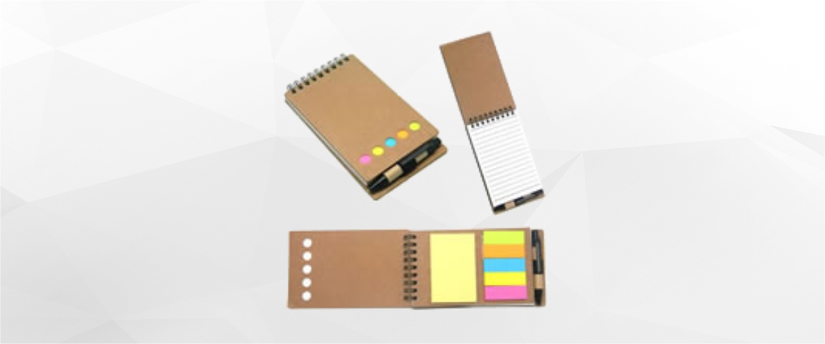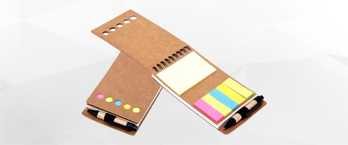 - Descrição: Bloco de anotações e caneta, material reciclado com post-it